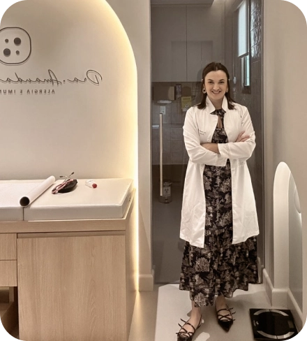Sou Amanda, médica alergista e imunologista clínica. Apesar da minha primeira formação ter sido em pediatria, hoje, meu trabalho é focado na alergo e imuno, e atendo tanto adultos quanto crianças.